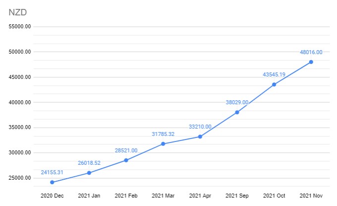 NZDで4,500程増えたが、先月に比べてNZDがJPYに対して弱くなってしまったため、日本円に直した時の先月比は微妙。今のところは生活も経済圏もNZDだからそこまで意識しなくていいけれども、もう少し資産が増えてきたらNZDと日本円に分散させることも考えた方がいいのかも?